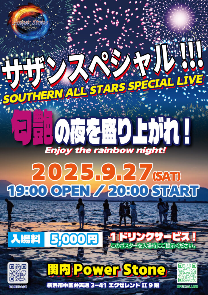 匂艶の夜を盛り上がれ!923がダイナミックに全20曲を熱唱! 開催日:2025年9月27日(土)入場料:5,000円 出演者: 🎹 キーボード:阿部樹一🎸 ベース:斎藤草平🎹 ピアノ:まい子🎷 サックス:藤原祐🥁 ドラム:一柳健司🎤 メインボーカル:923、知美 ※ドリンク・フード 5,000円/10,000円のメダルを購入していただきます。 アルコール 1メダル、フード 1メダル〜 ハイボール、各種焼酎、ビール、ワイン(赤・白)、ソフトドリンクなど。 当日はシャンパンメニューもございます。 タイムテーブル 開場19:00開演20:00